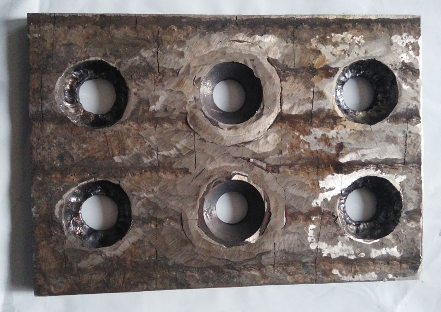 根據(jù)要求定制機加工好標(biāo)準(zhǔn)螺栓孔,然后在堆焊耐磨襯板采用等離子切割出直孔,將機加工好的螺栓孔件塞焊在堆焊耐磨襯板。